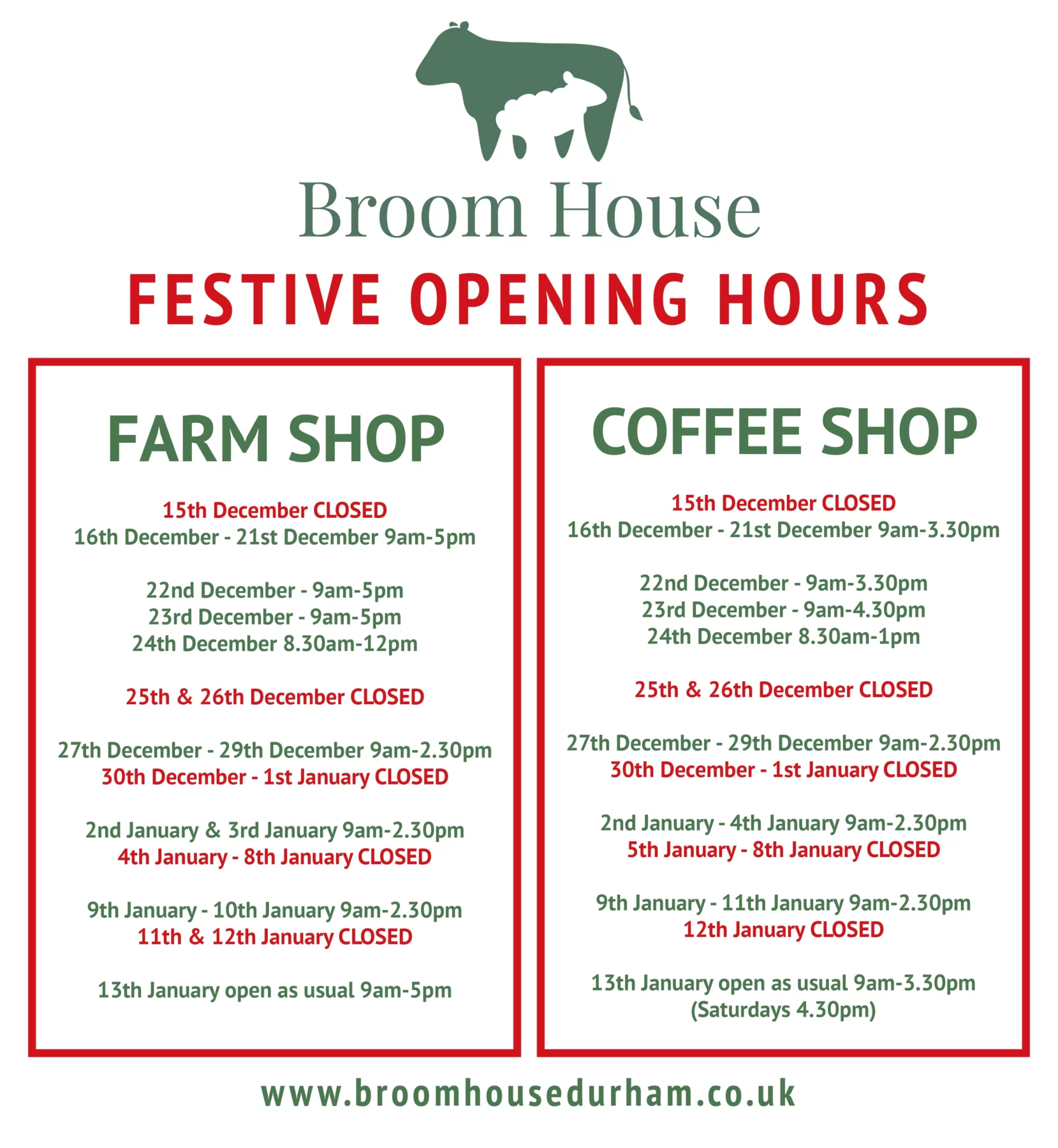 Please click here to find our Christmas Order Form – get ahead and order all your trimmings, gammon, stuffings and other Christmas essentials! Please complete forms and email to info@broomhousedurham.co.uk or pop up to the shop and ask one of our farm shop team for some guidance. A £25 is required before orders are confirmed.